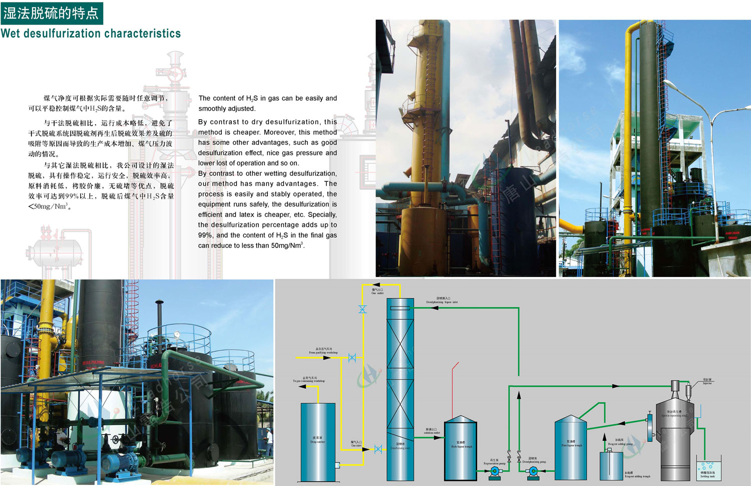 適用范圍:適用于化工、陶瓷、冶金、機械等多種行業(yè)的燃料氣以及城市煤氣的凈化、脫硫(去除H2S) 反應(yīng)原理:(1)吸收:在吸收塔內(nèi)原料氣與脫硫液逆流接觸,硫化氫與溶液中堿作用被吸收;H2S+Na2CO3=NaHS+NaHCO3 (2)析硫:在反應(yīng)槽內(nèi)Hs被高價金屬離子氧化成為單質(zhì)硫;NaHS+NaHCO3+2NaVO3=S↓+Na2V2O5+Na2CO3+H2O同時,生成的低價金屬離子被醌態(tài)物質(zhì)立即氧 化為高價金屬離子;Na2V2O5+Q(醌)NaCO3+H2O 2NaVO3+HQ(酚) 再生氧化:在噴射再生槽內(nèi)空氣將酚態(tài)物氧化為醌態(tài);2HQ+1/2O2 2Q+H2O 以上為過程按順序連續(xù)進(jìn)行,從而完成氣體脫硫凈化。